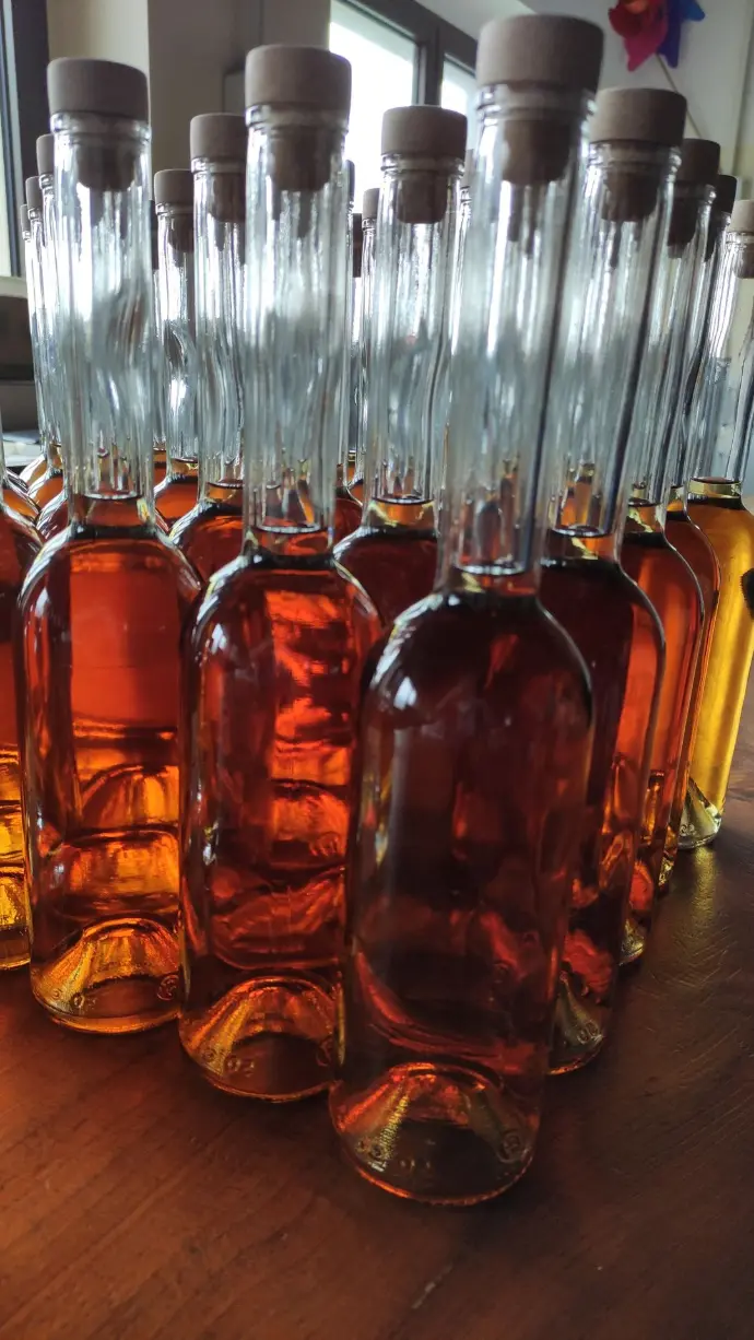 Da questo processo otteniamo la grappa bianca classica oppure diverse varianti aromatizzate. Per queste ultime utilizziamo erbe officinali che coltiviamo direttamente o erbe spontanee raccolte nelle nostre montagne. Impieghiamo inoltre i nostri piccoli frutti, che vengono messi in infusione per garantire una produzione d'eccellenza di liquori aromatizzati".