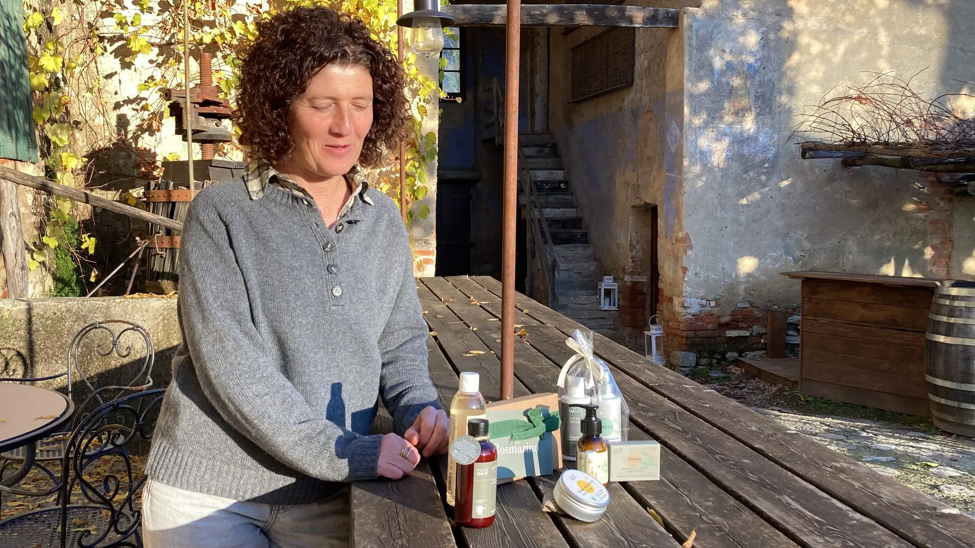 "Da qualche anno abbiamo lanciato il progetto "Patri Magri", una linea di cosmesi naturale, che valorizza il rosmarino, che a Montevecchia è sempre stata una coltivazione molto importante, e altri elementi come l'olio extravergine che noi produciamo, la cera d'api e il miele del territorio. I prodotti sono diversi: c' è un sapone con la profumazione di rosmarino e miele veramente molto intensa, lo stick labbra che in questa stagione è indispensabile e anche lì con la cera d'api e con l'olio extravergine veramente forte. E poi anche la crema nutriente, perché la facciamo insieme a un'altra cascina, un'altra azienda agricola, la cascina Bagaggera, che produce latte di capra e quindi qui dentro c'è un bel po' di latte di capra che serve proprio a nutrire la pelle".
