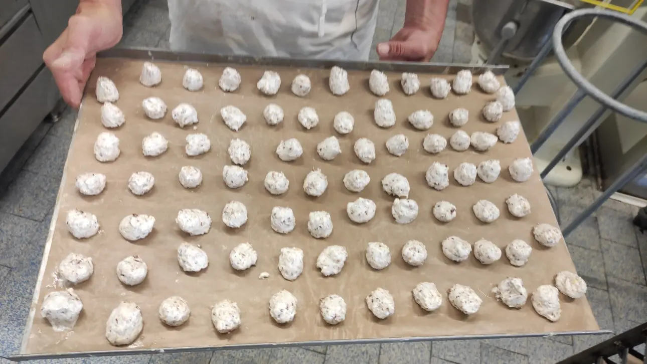 Per quanto riguarda l'albume, utilizziamo una combinazione di uova fresche lavorate da noi e albume pastorizzato, scelta necessaria per garantire i massimi standard di sicurezza alimentare su larga scala senza sacrificare la qualità. L'albume viene montato a neve ferma e unito con delicatezza alla miscela di frutta secca e zucchero. Grazie a uno strumento apposito, diamo forma ai biscotti che cuociono poi in forno per 35 minuti a 160°C.