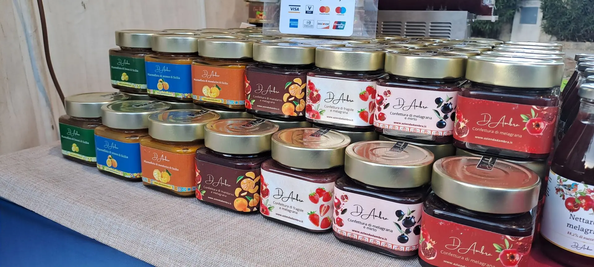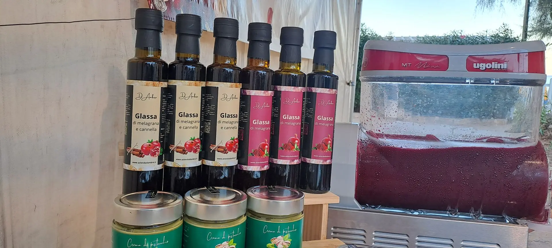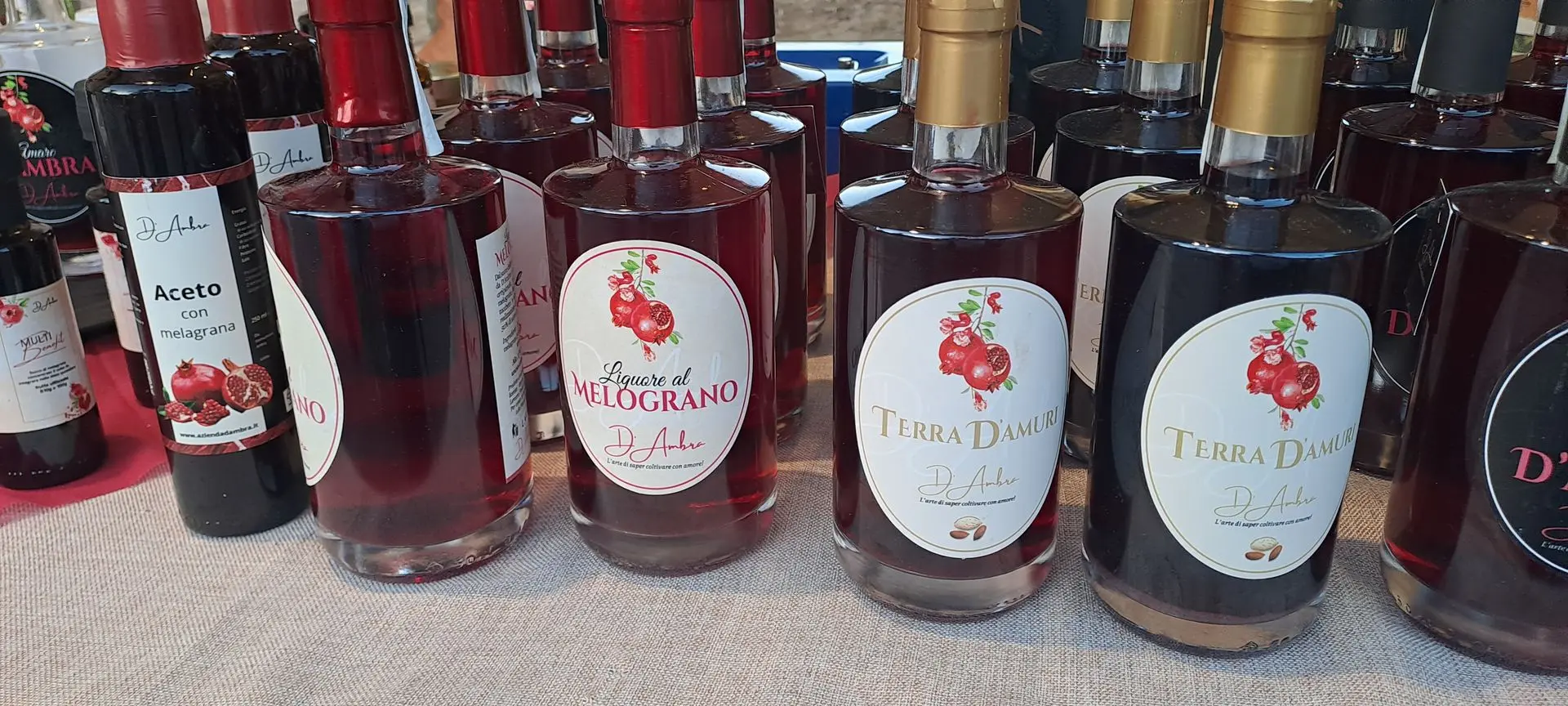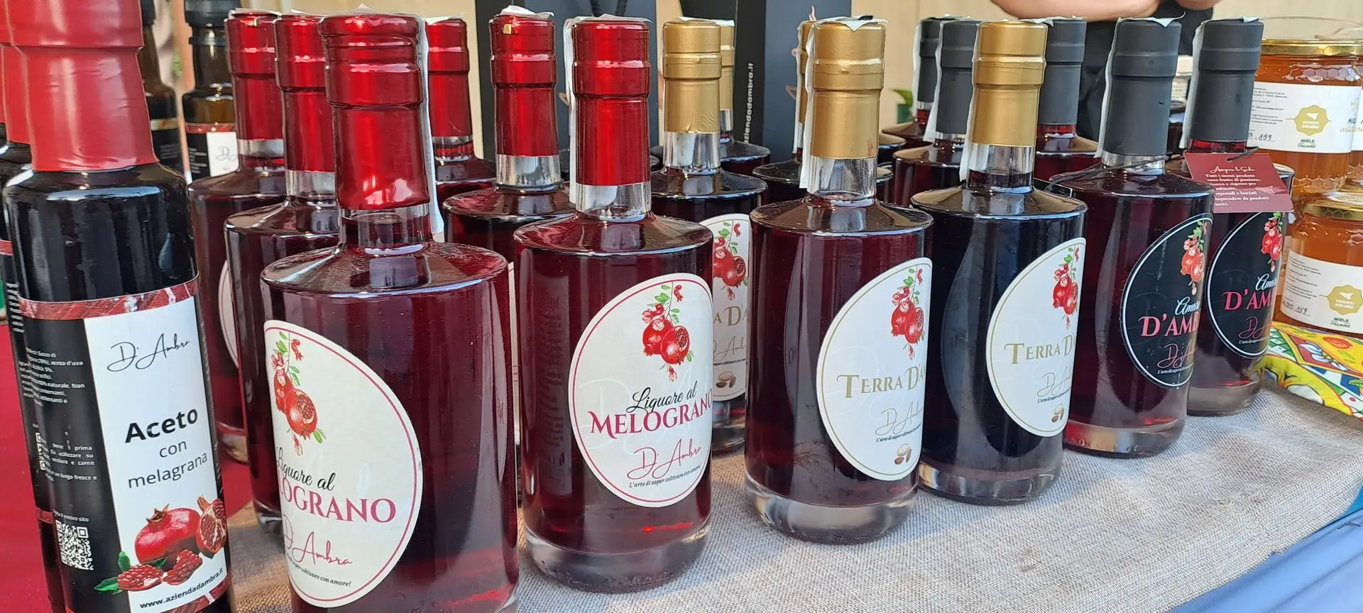 "Il nostro fiore all’occhiello è l’Amaro al melograno, battezzato “Amaro D’Ambra” proprio perché è una creazione esclusiva della nostra azienda.La sua ricetta è un inno al territorio: è composto per il 50% da melagrana, a cui aggiungiamo alcol e una selezione di erbe spontanee locali estremamente aromatiche.