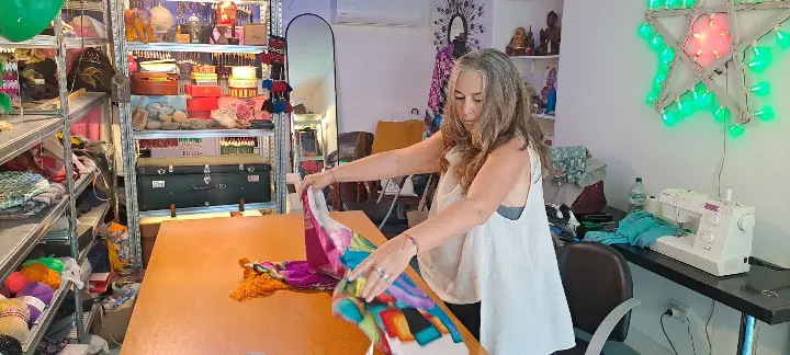«Il mio processo creativo non ha una regola. Di solito. vengo attratta da colori, da stoffe, da suoni e mi basta anche un piccolo pezzettino di stoffa che magari vedo per strada, oppure vedo in un negozio, e da lì, ricordando quello che ho in studio, costruisco praticamente tutto, anche da un piccolo pezzo. Già so come devo abbinare le lane per fare le frange, che sono fatte rigorosamente a mano. Sono capace di stare giornate intere anche la notte a lavorare su una stola, che ha dei tempi di lavoro un po' lunghi. Si tratta di svariate ore, perché poi se non mi piace la rifaccio la rigiro. Quello che faccio è che mi contraddistingue nell'intimo è unire insieme cose che apparentemente non potrebbero stare insieme. In questo caso i tessuti. Tessuti che apparentemente non potrebbero stare insieme sia per consistenza che per colori. La mia sfida è metterli insieme e renderli belli. Di solito ci riesco».